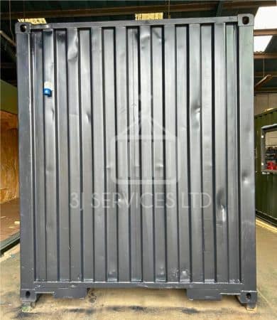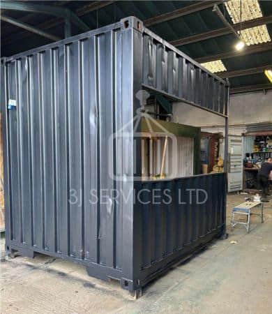 We cut a 10ft tube section from a 40ft container down to 8ft and fitted it with a bench, cigarette bin, steel chequer plate floor, and an internal light which included a consumer unit, switch, sockets and light. The shelter was then painted RAL9004 (dark grey) externally and a really lovely RAL5021 (teal) inside.